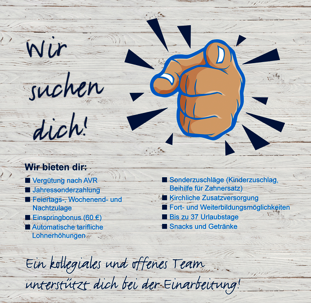 Um auch in Zukunft unser tolles Team zu stärken, sind neue Mitarbeitende stets willkommen. Eine begleitende Einarbeitung, tarifliche Entlohnung nach AVR-DD sowie Vereinbarkeit von Familie und Beruf sind bei uns selbstverständlich.